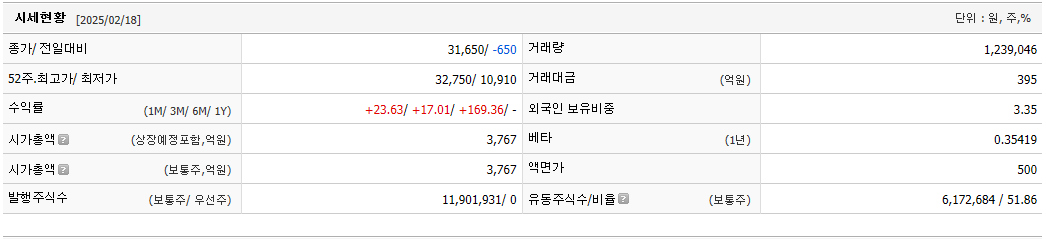 에이치브이엠의 시가총액은 2025년 2월 19일 기준 3,505억 원이고 발행주식 수는 11,901,931 유동주식수는 6,172,684 유동 비율은 51.86%입니다.