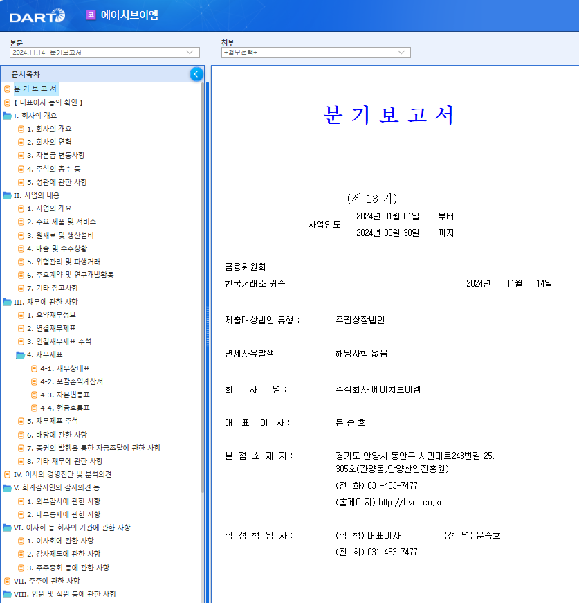아래 버튼을 누르시면 에이치브이엠의 분기보고서를 확인할 수 있습니다.