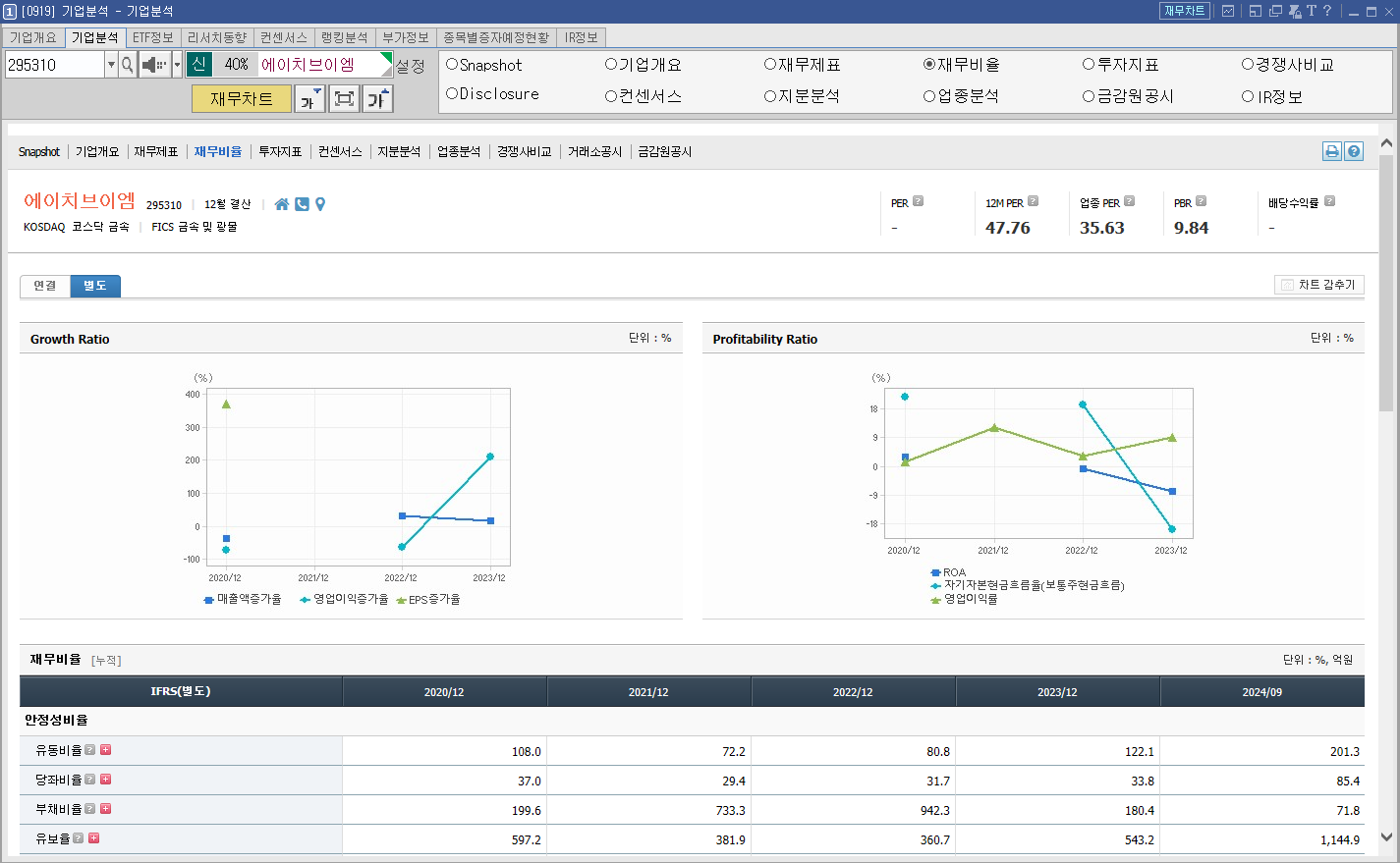 아래 사진에서 에이치브이엠의 부채비율, 유보율을 보면 좋은 수치인 것을 확인할 수 있습니다.